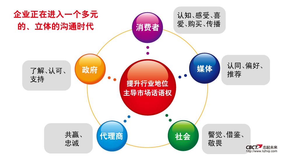 品牌3.0时代,企业正在进入一个多元的、立体的沟通时代,企业不仅要与消费者沟通,得到消费者的认知、感受、喜爱、购买和传播;还要得到政府的了解、认可与支持;得到媒体的认同、偏好和推荐;与代理商双赢;对社会舆论保持警觉和敬畏,注重公共关系建设。